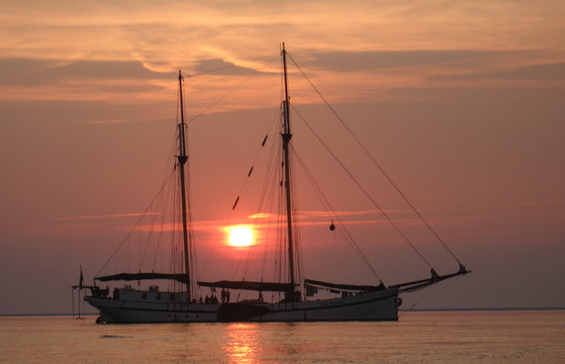 Nach einem ausgiebigen Frühstück heißt es: Leinen los! Der Matrose erklärt, wie Sie Knoten binden und die Segel hissen. Wer will, packt mit an. Dann fangen die Segel den Wind und das Schiff gleitet lautlos über das Wattenmeer – kein Motorengeräusch, allein die Kraft des Windes trägt Sie über die Wellen.
