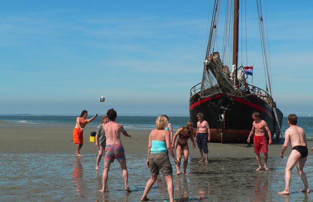 Auch dies kann man erleben. Mit ablaufendem Wasser fährt der Skipper das Schiff auf eine Sandbank und bald wird die Wassertiefe rund ums Schiff so gering, dass man nicht mehr wegfahren kann. Das ist dann eine großartige Gelegenheit, sich im flachen Wasser rund ums Schiff abzukühlen. Nach ein paar Stunden wird das Meer ganz verschwunden sein und man kann auf dem Seeboden spazieren gehen und so das Schiff einmal aus einer ganz anderen Perspektive bewundern.