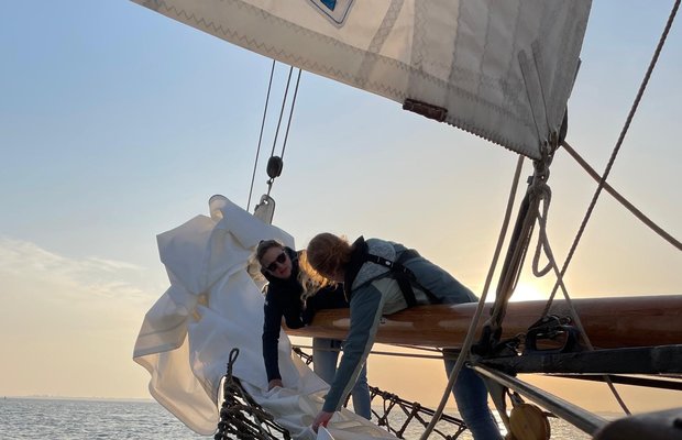Zwischen den Molen setzen wir zum ersten Mal die Segel und wir verlassen den Hafen. Die Fallen und Schoten sind belegt, das Schwert an Lee verhindert das Abtreiben des Schiffes und der Motor ist aus… Stille. Segeln ist ein naturwissenschaftliches Wunder- und Sie sind hautnah dabei.